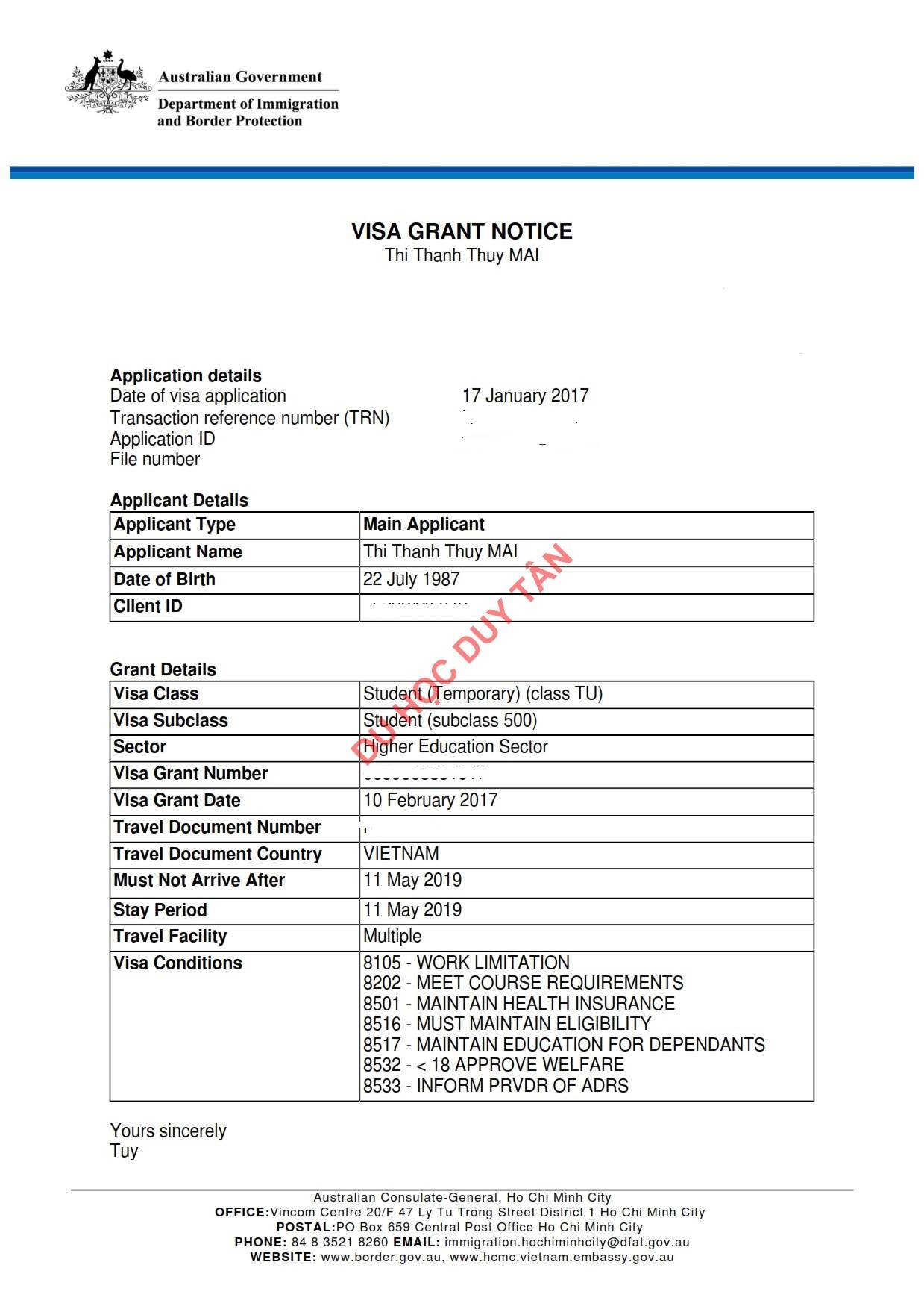 Du học Úc - Chúc mừng Mai Thị Thanh Thủy đã có visa du học Úc!