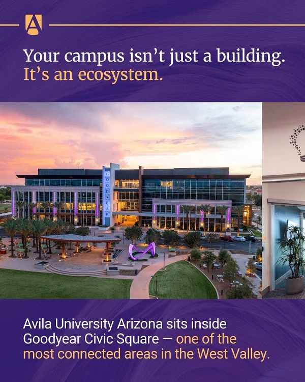 Đại học Avila mang đến sự kết hợp giữa di sản học thuật trên 100 năm tuổi và campus mới cho hệ Thạc sỹ được tọa lạc ngay Goodyear, Arizona- cách trung tâm Phoenix 20 phút lái xe (Top 5 thành phố lớn nhất Mỹ).