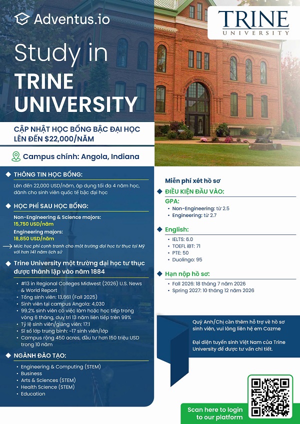 DU HỌC MỸ - TRINE UNIVERSITY – CẬP NHẬT HỌC BỔNG BẬC ĐẠI HỌC LÊN ĐẾN $22,000/NĂM